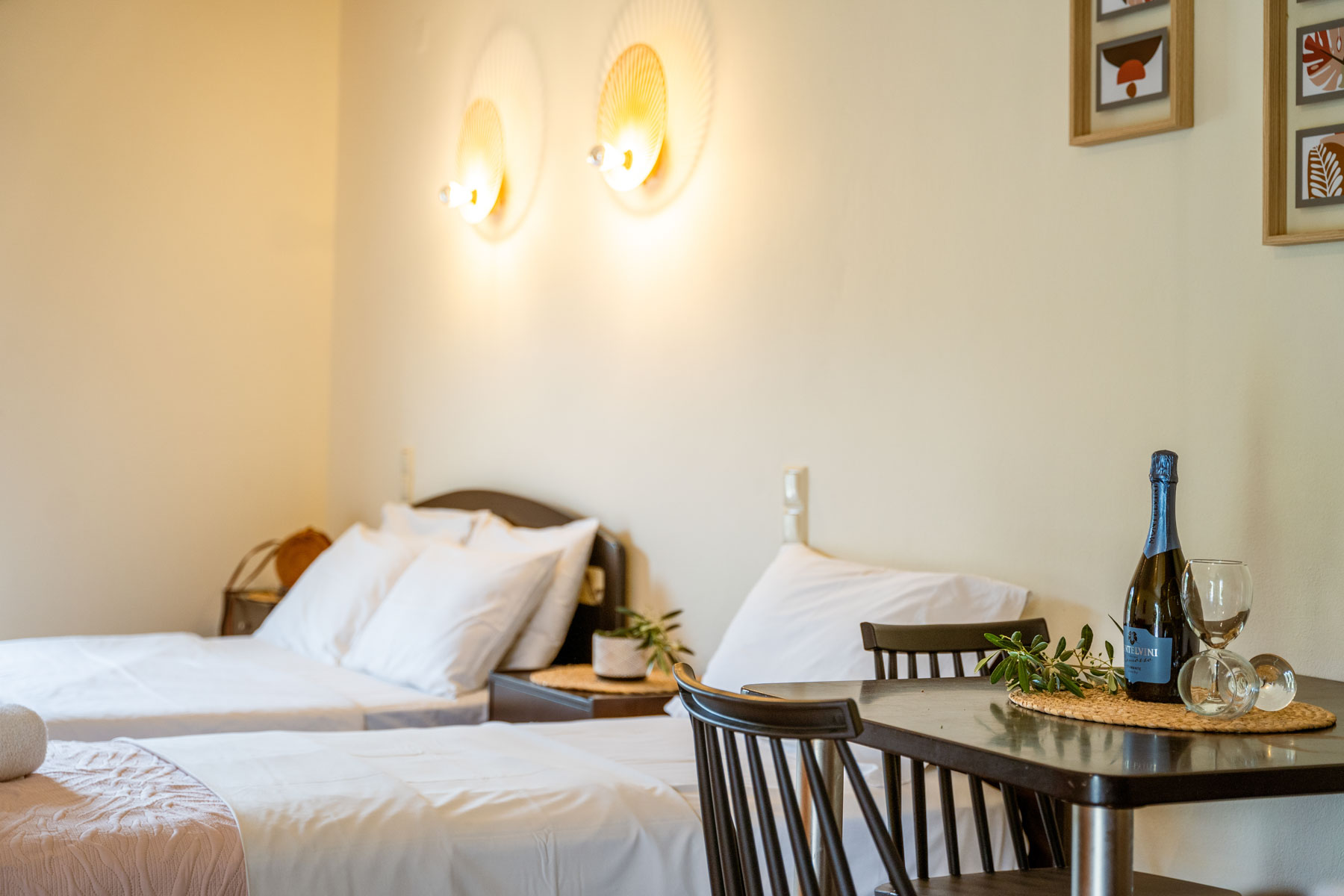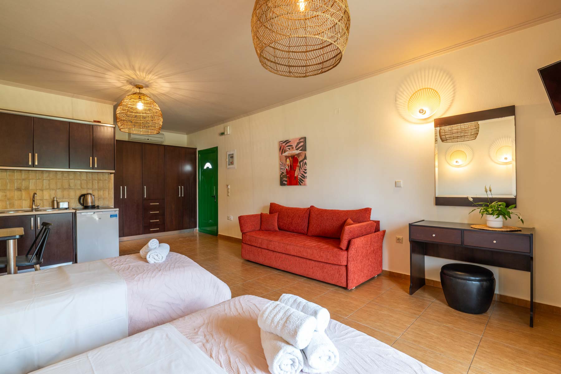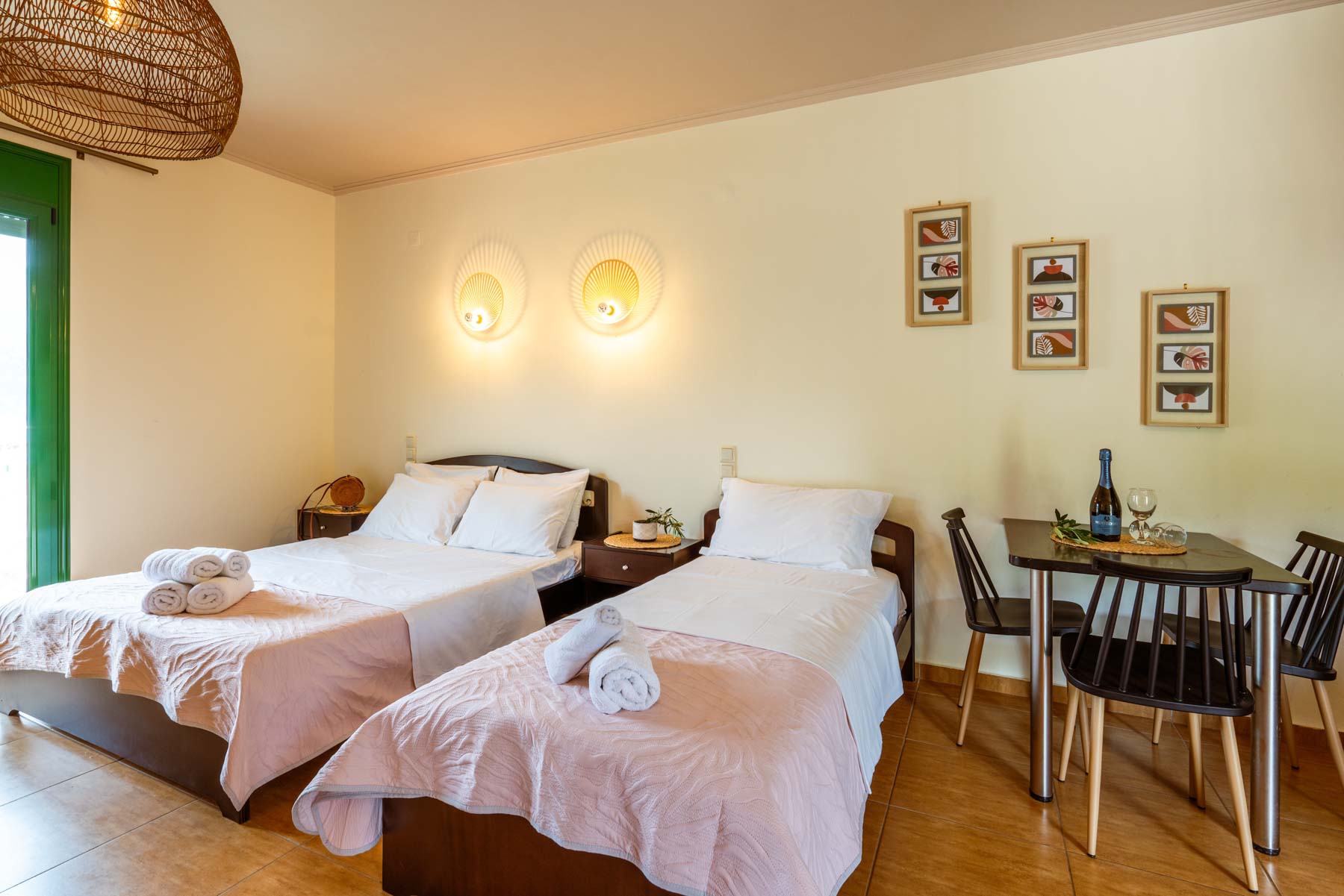 It features two separate spaces. One main room with a fully equipped kitchen and twin beds. Second space is a beautiful bathroom. There is also a sofa that can easily be converted to a comfortable double bed. It also provides a picturesque balcony with dinning table and garden with lawn. Exclusive fast speed Wi-Fi, in wall closets, indoor ,outdoor dinning options are also available. Don’t forget to enjoy the outdoor BBQ or a cocktail / snack at Aiora Bar.