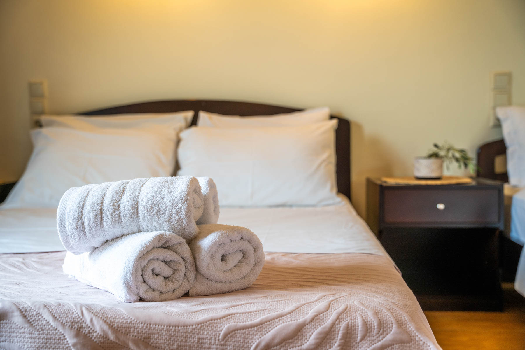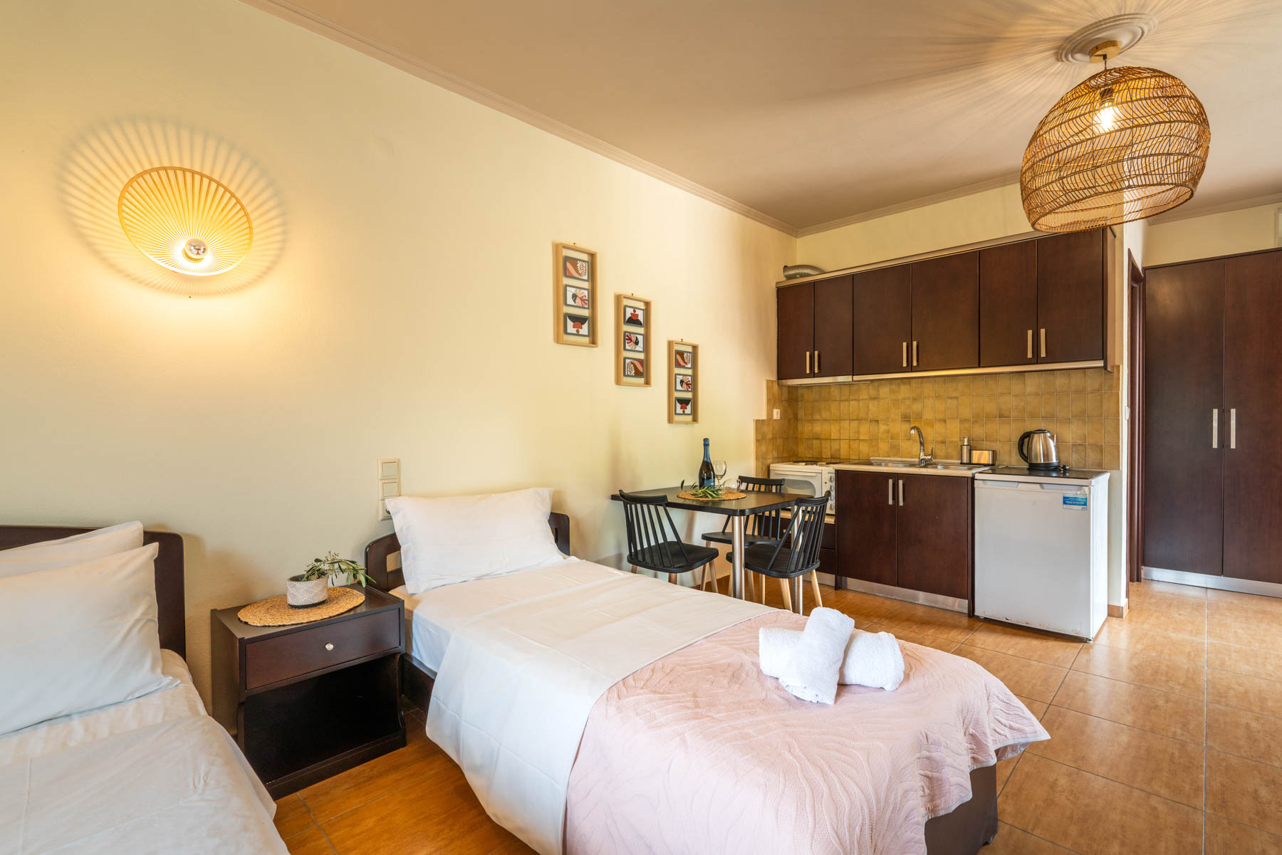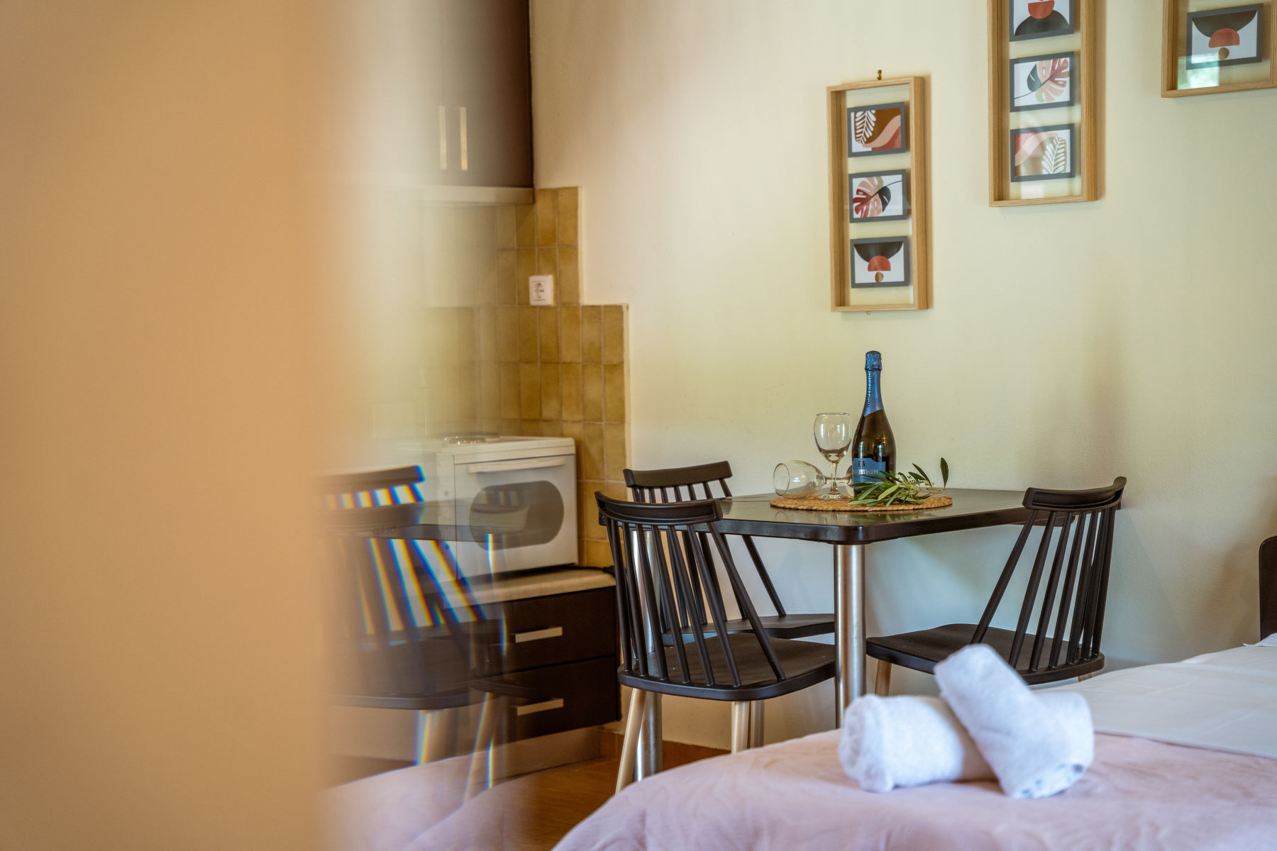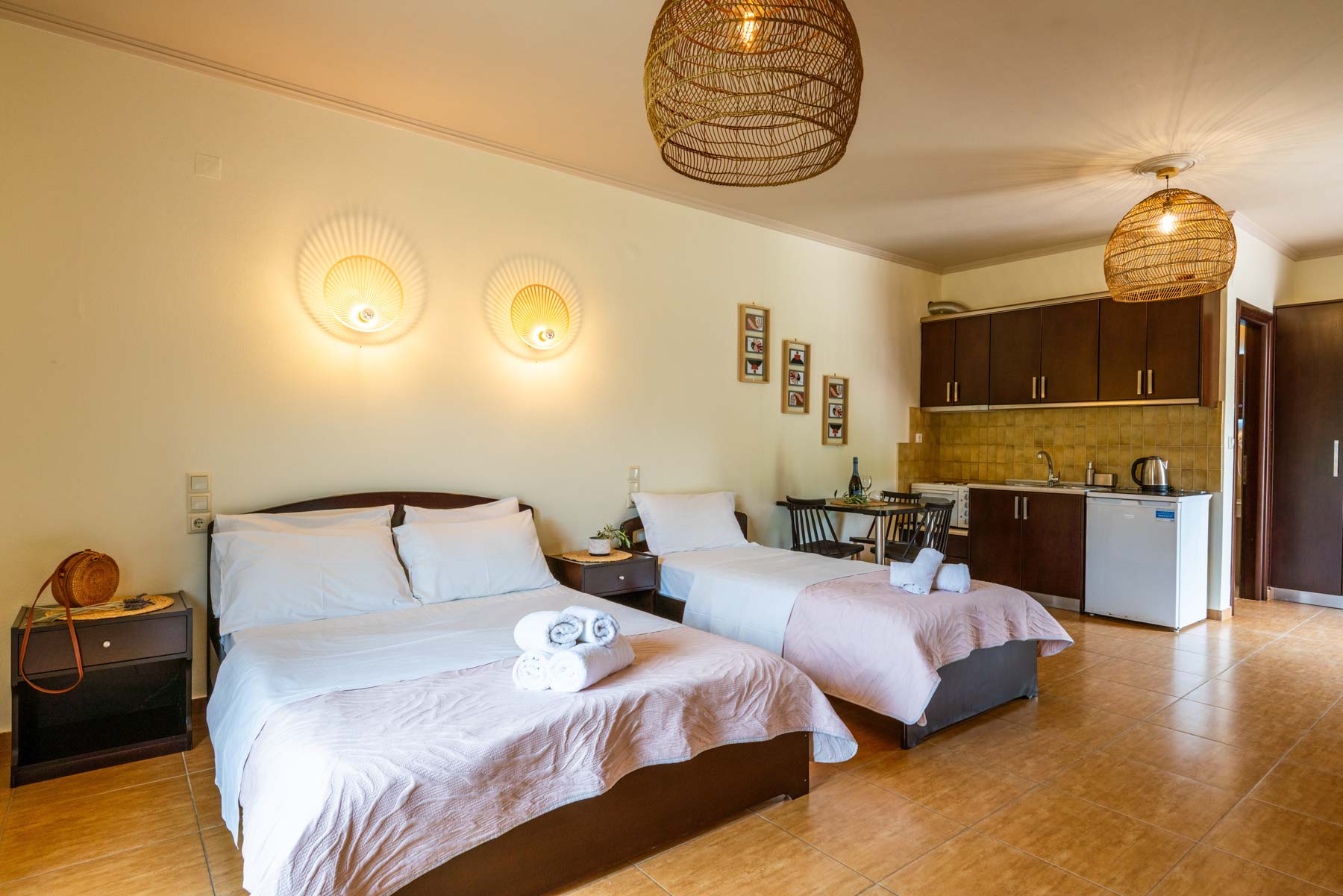 It features two separate spaces. One main room with a fully equipped kitchen and twin beds. Second space is a beautiful bathroom. There is also a sofa that can easily be converted to a comfortable double bed. It also provides a picturesque balcony with dinning table and garden with lawn. Exclusive fast speed Wi-Fi, in wall closets, indoor ,outdoor dinning options are also available. Don’t forget to enjoy the outdoor BBQ or a cocktail / snack at Aiora Bar.